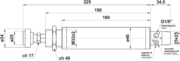 Cilindro pressore ø35 corsa 75 con tampone di spinta, con valvola di blocco 1/8" e testata anteriore filettata