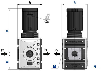 Regolatore di pressione G1/2", P1 passante, pressione massima 8 bar
