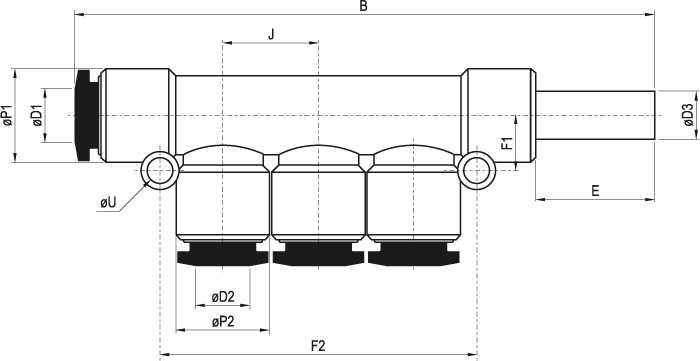 | tubo (øD1) | tubo (øD2) | øD3 | øP1 | øP2 | J | F1 | F2 | øU | B | E | confez. | codice |
