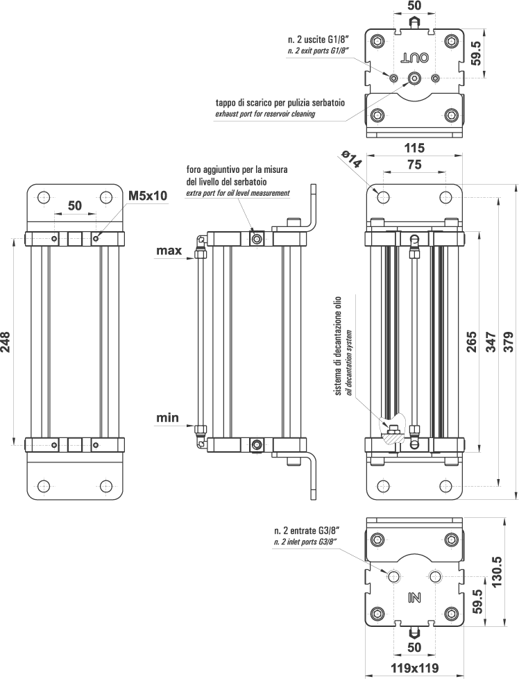 Permette il rifornimento. La pulizia avviene svitando l'apposito tappo di scarico. Installazione verticale. Fissaggio con piedini (inclusi).