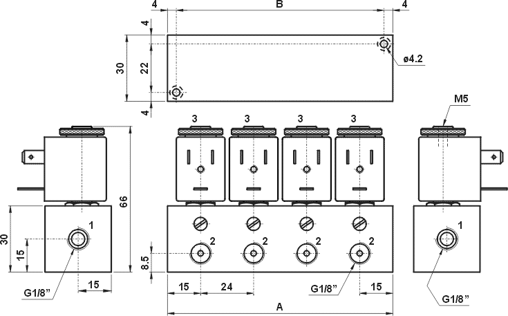 Base con 3 elettropiloti con azionatore manuale, senza bobine