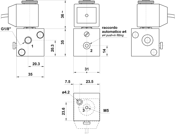 Base modulare con elettropilota NC ATEX, uscite tubo ø4, con azionatore manuale, senza bobina