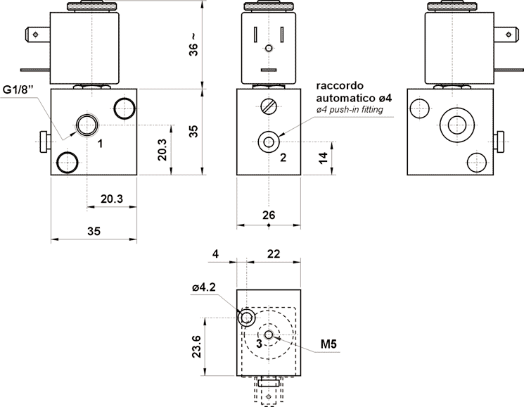Per utilizzare questo prodotto come valvola 2/2, per ogni elettropilota è necessario acquistare la ghiera in alluminio (codice 00.125.2) e il tappo M5 (codice 36.643.0).