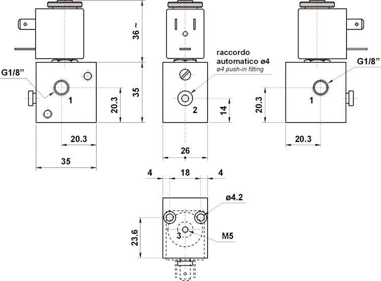 Per utilizzare questo prodotto come valvola 2/2, per ogni elettropilota è necessario acquistare la ghiera in alluminio (codice 00.125.2) e il tappo M5 (codice 36.643.0).