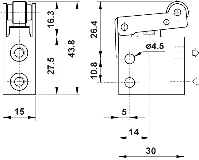 3/2 NA, attacchi filettati M5 laterali, leva rullo