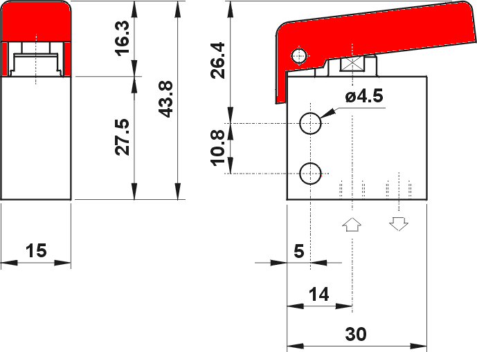 3/2 NA, attacchi filettati M5, tasto ROSSO