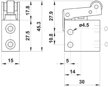 3/2 NC, attacchi filettati M5 laterali, leva rullo