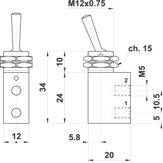 3/2 NC, attacchi filettati M5, leva in testa bistabile, scarico non convogliabile