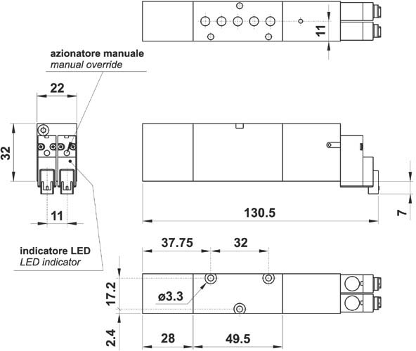 5/3 1/8" centri chiusi, doppio comando elettrico 24V DC, versione uscite in base
