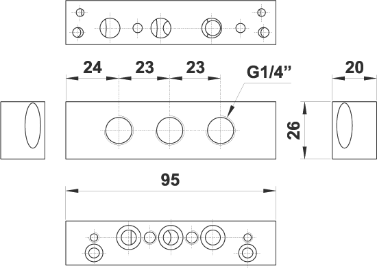 Questa sottobase di riduzione è utilizzata per l'nstallazione di valvole da 1/8" in una batteria di valvole da 1/4", formando così una batteria ibrida. È dotata di connessioni supplementari G1/4", da tappare in caso di mancato utilizzo. È venduta con i particolari necessari per il montaggio.