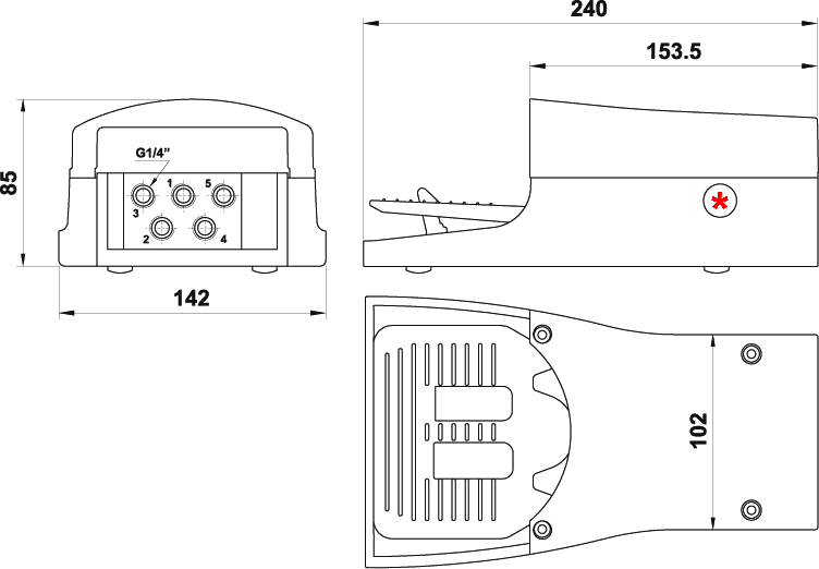 Pedale 5/2 1/4" monostabile senza protezione, con fermo di sicurezza e pulsante di riarmo