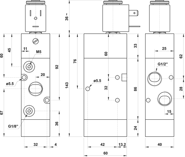 3/2 1/2" NA comando elettrico, ritorno a molla, senza bobina