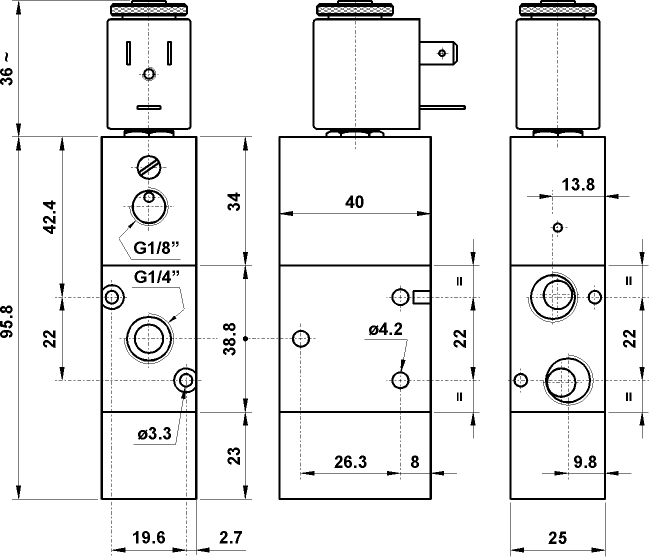 3/2 1/4" comando elettrico alimentazione separata, ritorno a molla, senza bobina