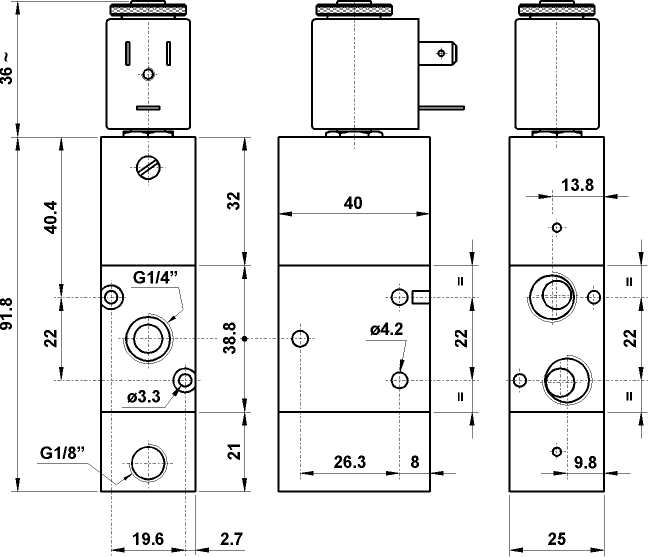 3/2 1/4" comando elettrico, riposizionamento a comando pneumatico, senza bobina