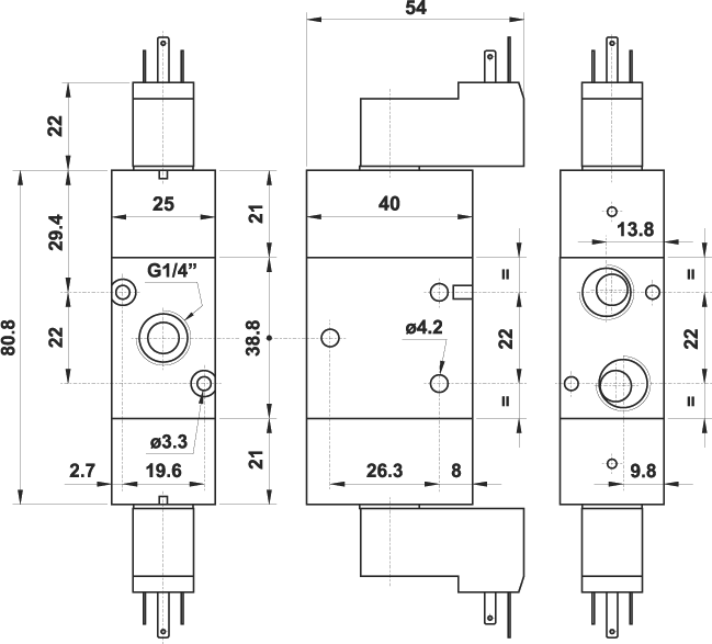3/2 1/4" doppio comando elettrico con elettropilota 15 mm, 24V DC