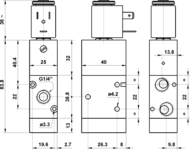 3/2 1/4" NC comando elettrico, ritorno a molla, senza bobina