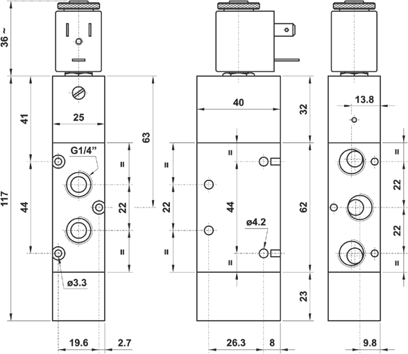 5/2 1/4" comando elettrico, ritorno a molla, senza bobina, fondello rinforzato