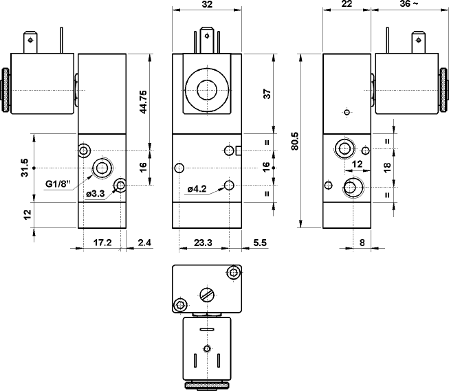 3/2 1/8" NC comando elettrico a 90° sul lato largo, ritorno a molla, senza bobina