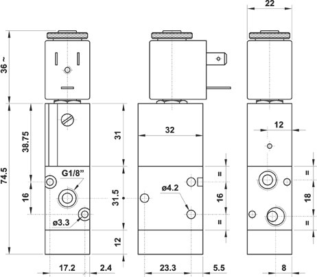 3/2 1/8" NC comando elettrico - ritorno a molla, con sede sensore