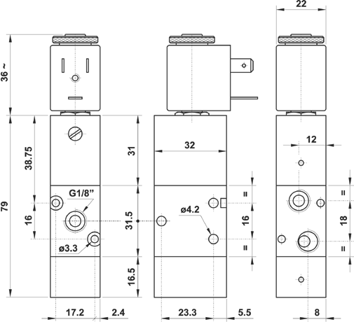 3/2 1/8" NC comando elettrico, ritorno a molla pneumatica, senza bobina