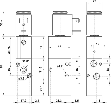 3/2 1/8" NC comando elettrico - ritorno a molla rinforzata, con sede sensore