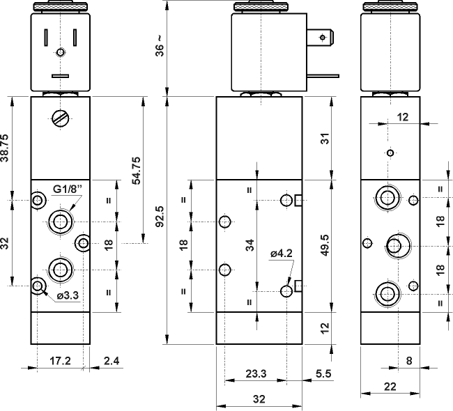 5/2 1/8" comando elettrico, ritorno a molla, senza bobina