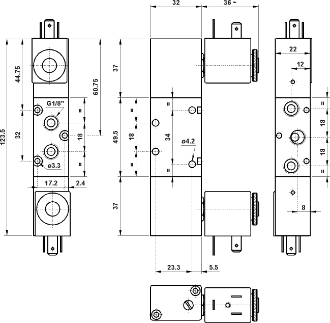 5/2 1/8" doppio comando elettrico a 90° sul lato stretto, senza bobine