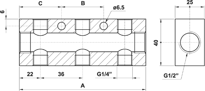 Collettore doppio 4 fori G1/4", foro passante G1/2"