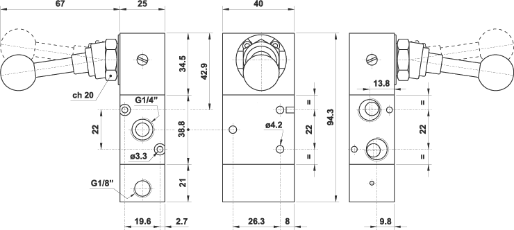 3/2 1/4" leva 90°, riposizionamento a comando pneumatico