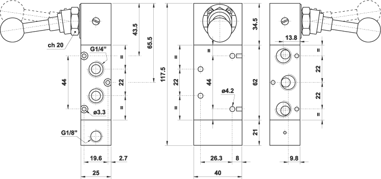 5/2 1/4" leva 90°, riposizionamento a comando pneumatico