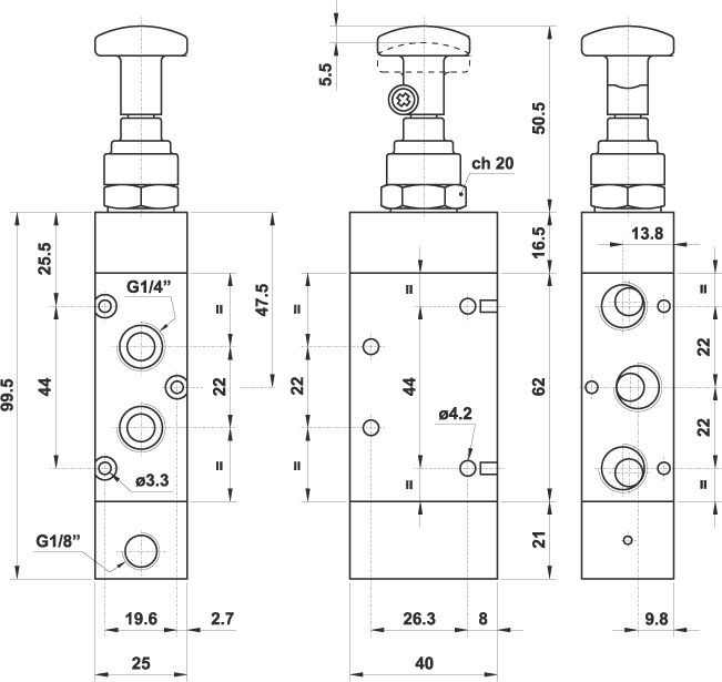 5/2 1/4" tiretto sganciato, riposizionamento a comando pneumatico