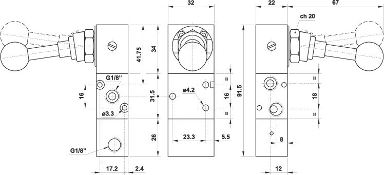 3/2 1/8" leva 90°, riposizionamento a comando pneumatico