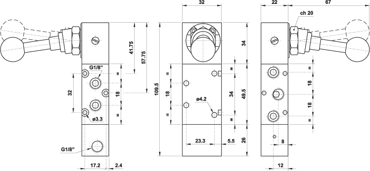 5/2 1/8" leva 90°, riposizionamento a comando pneumatico
