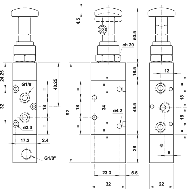 5/2 1/8" tiretto sganciato, riposizionamento a comando pneumatico