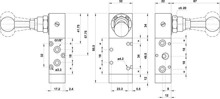 5/3 1/8" centri in pressione, leva 90°, tre posizioni stabili