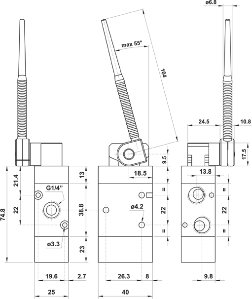 Valvola ad azionamento meccanico 3/2 1/4" antenna ad asta regolabile, ritorno a molla