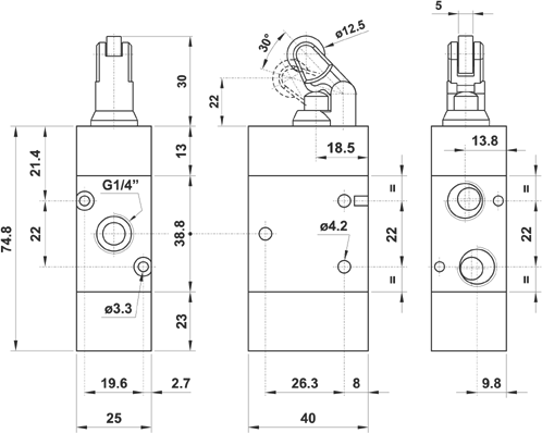 Valvola ad azionamento meccanico 3/2 1/4" leva rullo, ritorno a molla