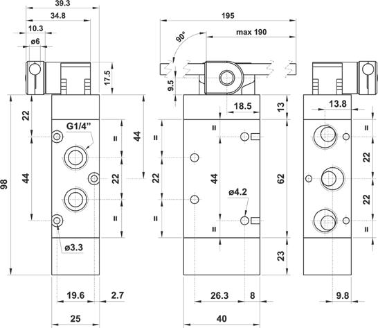 Valvola ad azionamento meccanico 5/2 1/4" asta regolabile ø6 in fibra di vetro, ritorno a molla
