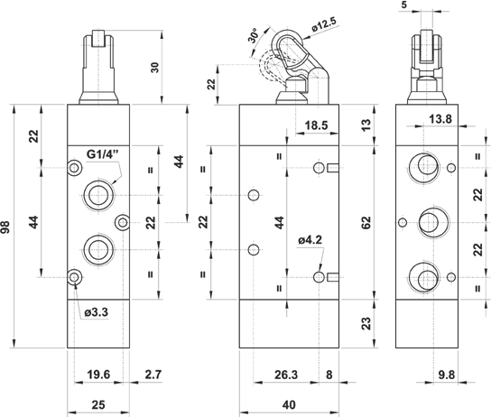Valvola ad azionamento meccanico 5/2 1/4" leva rullo, ritorno a molla