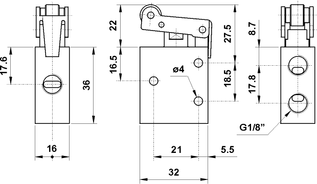 16 mm 3/2 1/8" leva rullo corta, ritorno a molla