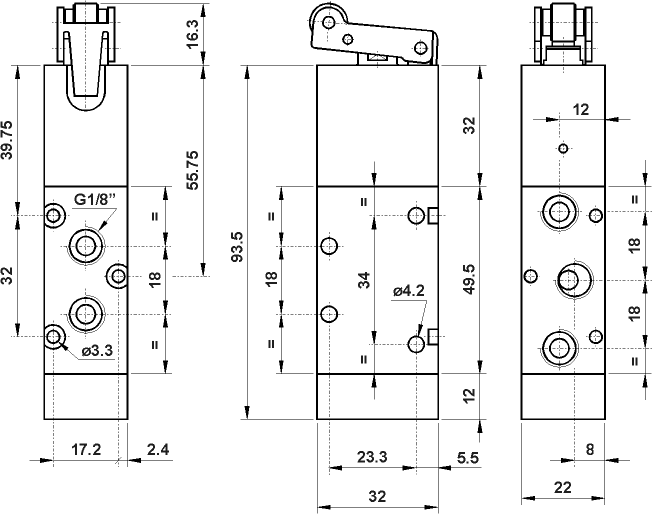5/2 1/8" leva rullo servopilotata, ritorno a molla