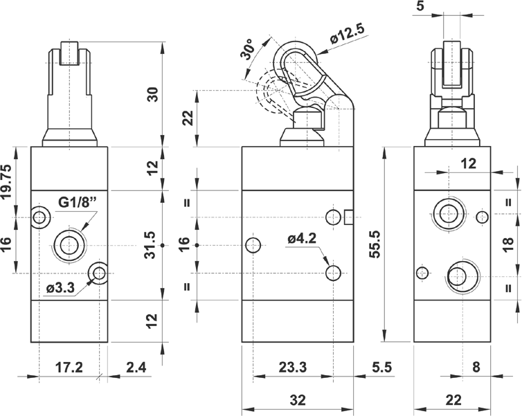 Valvola ad azionamento meccanico 3/2 1/8" leva rullo, ritorno a molla
