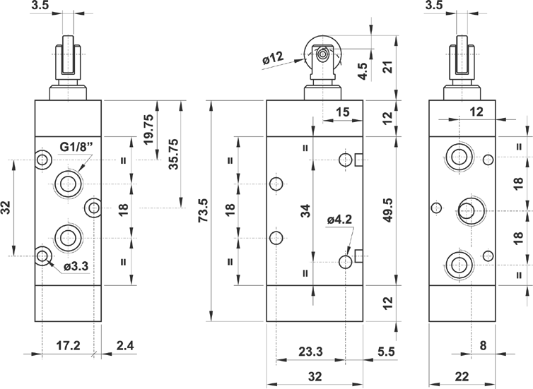 Valvola ad azionamento meccanico 5/2 1/8" pulsante con cuscinetto a rullo, ritorno a molla