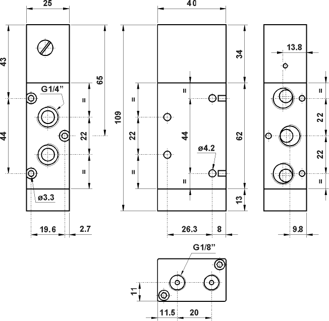 5/2 1/4" comando pneumatico con elemento OR integrato, ritorno a molla