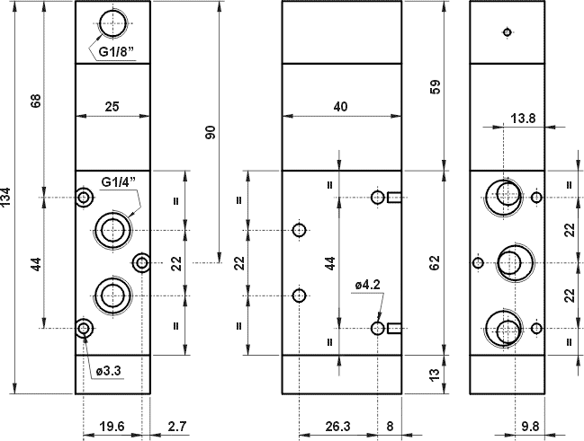 5/2 1/4" comando pneumatico, ritorno a molla, pressione minima di azionamento 0.6 bar
