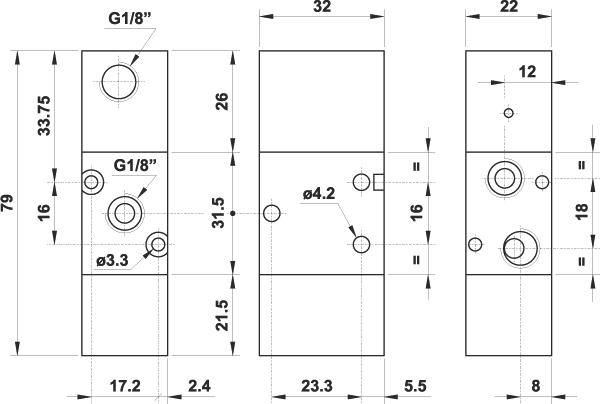 3/2 1/8" NC comando pneumatico, ritorno a molla, fondello rinforzato