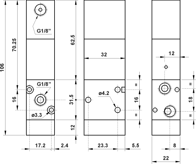 3/2 1/8" NC comando pneumatico, ritorno a molla, pressione minima di azionamento 0.6 bar